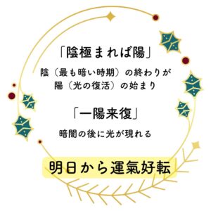 - 冬至:陰が最高潮に達し、陽が芽生える時
