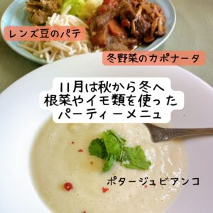 <11月>銀杏ご飯・根菜のカポナータ・ポタージュビアンコ・レンズ豆のパテ・蕪の酢もの・里芋の胡麻和え。